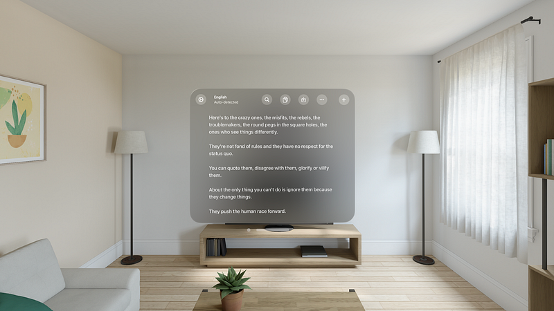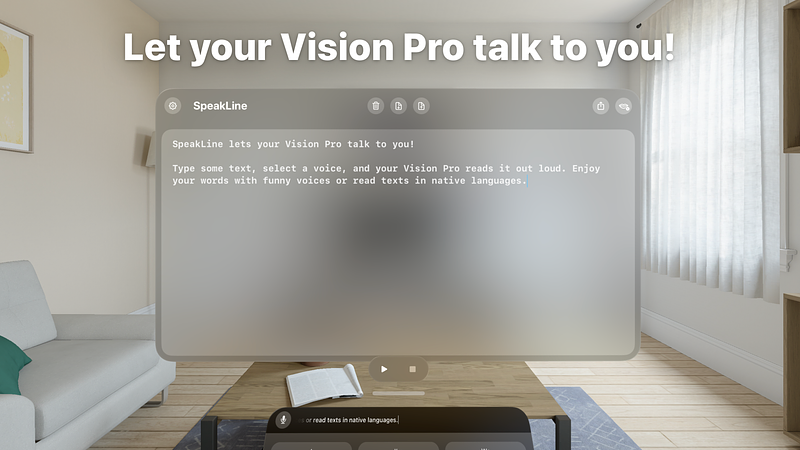 SpeakLine lets your Vision Pro talk to you! Type some text, select a voice, and your Vision Pro reads it out loud. Enjoy your words with funny voices...