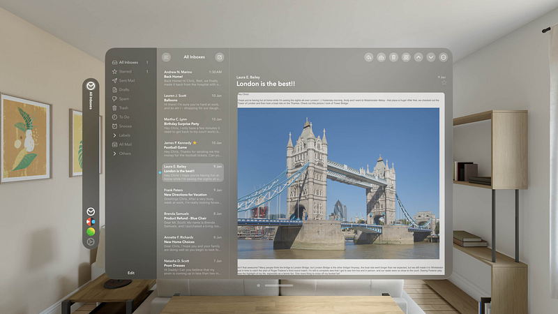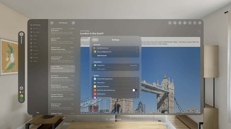 5.7.4** Apple Design Award Winner ** "Airmail for Apple Vision Pro" is an enhanced email management application, specifically tailored for the advanced capabilities of the Apple Vision Pro platform. Maintaining its user-friendly interface, the app boasts a sleek and contemporary design, with a Privacy Safe environment that adapts effortlessly to the unique display and features of the Apple Vision Pro. Airmail is a powerful mail client for Mac, iPhone, iPad and now Apple Vision Pro. Workflow customization is at the core, with a rich feature set like snooze, interactive push notifications, and full inbox sync. iCloud sync provides a fully ubiquitous experience so that all your accounts and app preferences are synced. - Support for Gmail, Exchange EWS, Outlook 365, IMAP and POP3
