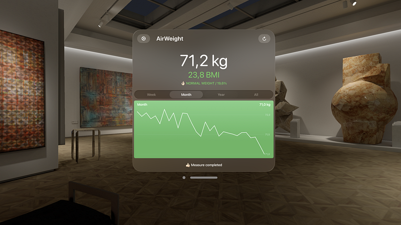 • AirWeight can optionally sync past measurements using iCloud so that they can be viewed on devices without HealthKit support, such as a Mac or Apple TV. This feature needs to be enabled in the app settings of each device. At least one device with HealthKit support is required to propagate the measurements to other devices.