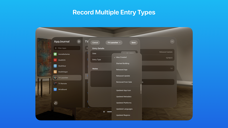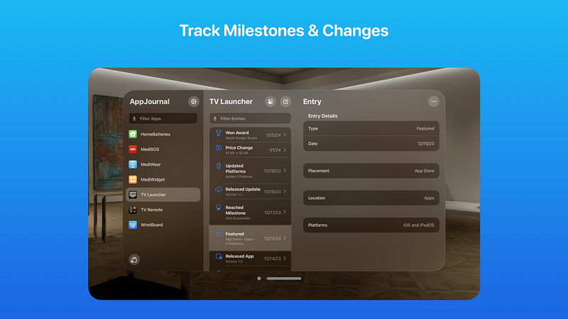 1.1AppJournal provides indie app developers with a simple utility to record app milestones & changes. Developed for Apple platform developers, you can use AppJournal to track when your app has been featured, changes youʼve made to metadata, awards won, prices changes and much more. Each entry supports multiple fields for recording multiple data types and the ability to set the date and add notes too. AppJournal contains these great features: JOURNAL AppJournal keeps track of your appʼs history by enabling you to create new entries when you make changes or have something to celebrate. ENTRY TYPES Built-in to AppJournal are multiple entry types which can be complemented with additional metadata, such as which platforms a change was made for, links to an article that the app was featured in and from/to fields so you can see exactly what is different. The entry types included are: - Idea Created