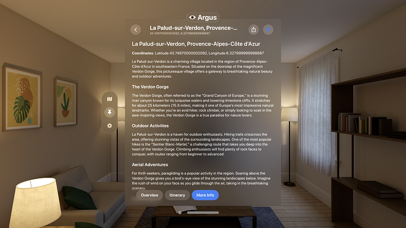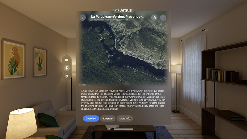 1.0.2Argus is a ChatGPT-powered world explorer designed from the ground up for Vision Pro. Travel the world without leaving your couch, and learn about culture, climate, geography, and more as you go! The only limit is your imagination. Bring your own OpenAI API key, and you're ready to start traveling with Argus!