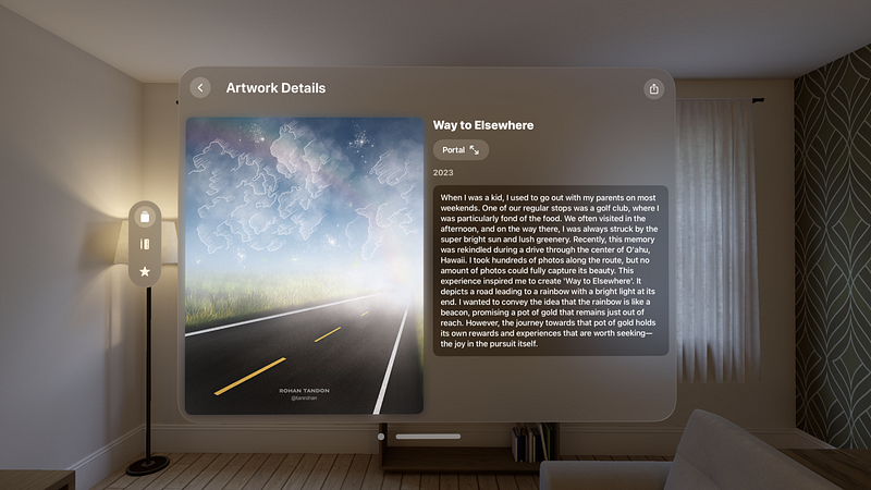 • On Apple Vision Pro, you can view artworks at a life-like scale, and through a portal window. Portal window surrounds you with Spatial Audio, bringing you to the artwork's unique environment.