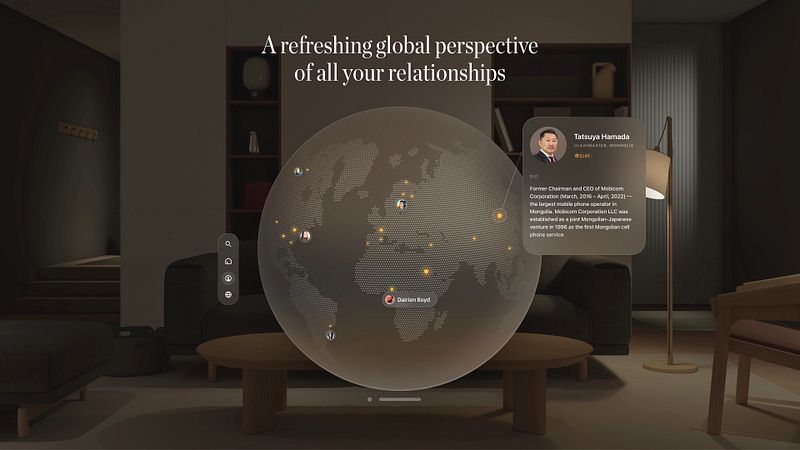 2024.4Clay for Apple Vision Pro is a productivity must-have, seamlessly visualizing your network and relationships in a brand new dimension. With the power of spatial computing, you can browse, explore, and interact with the people in your life like never before. Interact with and explore your relationships in 3D with Clay's new Holodex, intuitively seeing people you’ve seen more recently and reaching out to them easily. Clay puts the full breadth of your network at your fingertips. Discover the global reach of your network with Clay’s unique Globe view. Browse your contacts across the world, and magically tap on each one to see your relationship history. View your Clay contact cards alongside FaceTime video tiles for at-a-glance information about your last conversation with someone. Take notes easily without breaking your conversation.
