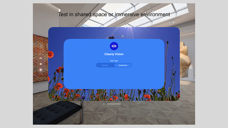 This app runs in two modes: a shared space window environment, and an adjustable immersive environment where windows from other apps are hidden. It defaults to the shared window space, but you can choose the other mode in the main Settings tab. We recommend that you sit down while running this app in immersive mode. In this mode, the test panel will be anchored approximately 5 feet from the position of your head, and you should move the main window to an accessible location before beginning the test. Select either the Short test or Extended test duration to check your peripheral vision. When the test opens, a visual panel will appear in front of you. For best results, you may need to carefully step forward or backwards until the panel fully covers your front and peripheral vision before starting the test. Look in the green viewer area while you use your peripheral vision to catch the random white dots that appear in each of the four panels (Top Left - TL, Top Right - TR, Bottom Left - BL, and Bottom Right - BR). Click the button corresponding to the panel where you saw the white dot. The timing and location of the dots are randomized. Do not look right at the dots while performing the test, as it will yield inaccurate results. When the test completes, you may view your results. Snap a screenshot to keep it for your records. Motivation: