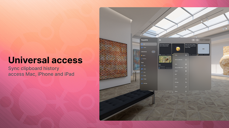 2.10.9PastePal is a native application written in pure Swift that allows complete control over your clipboard history. The app is universal and available across Mac, iPhone and iPad devices. You can manually enable iCloud Sync in Settings and all data will be securely synced across devices Many features