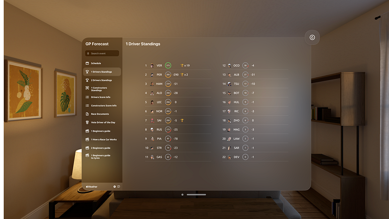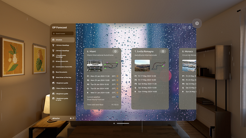 2.0.2Are you a real racing fan? Do you want to experience the thrill of wet races in immersive VR? Do you want to stay updated on the latest standings, documents, and votes? Do you want to learn more about the cars, the scoring, and the tires? If you answered yes to any of these questions, then this app is for you! GP Forecast is the ultimate app for racing enthusiasts. With this app, you can: • Watch the weather conditions of each race in stunning VR. Feel the raindrops on your face, hear the thunder in your ears in spacial audio, and see the lightning in your eyes. Wet races are more exciting and unpredictable, so you will never get bored of following the weather each race. • Get hourly weather forecasts for each race location. Plan your viewing schedule accordingly and never miss a moment of action. • See the drivers and constructors standings. Find out who is leading the championship, who is chasing them, and who is falling behind. You can also see the points breakdown for each race and each driver. • Preview the track in details with DRS points, and check on the map where the race is located. • Access the official race documents, such as the race director’s notes, the stewards’ decisions, the technical regulations, and the sporting regulations. Learn about the rules and regulations that govern the sport and how they are enforced. • Vote for the driver of the day after each race. Show your support and appreciation for your favorite driver and see how other fans voted. You can also see the results of previous votes and the reasons behind them. • Learn more about the cars, the scoring, and the tires. If you are new to racing or want to refresh your knowledge, this app will help you understand the basics and the details of the sport. You can see how the cars work, how the scoring system works, and how the tires affect the performance and strategy. It supports the following immersive weather conditions with accompanying spacial audio: