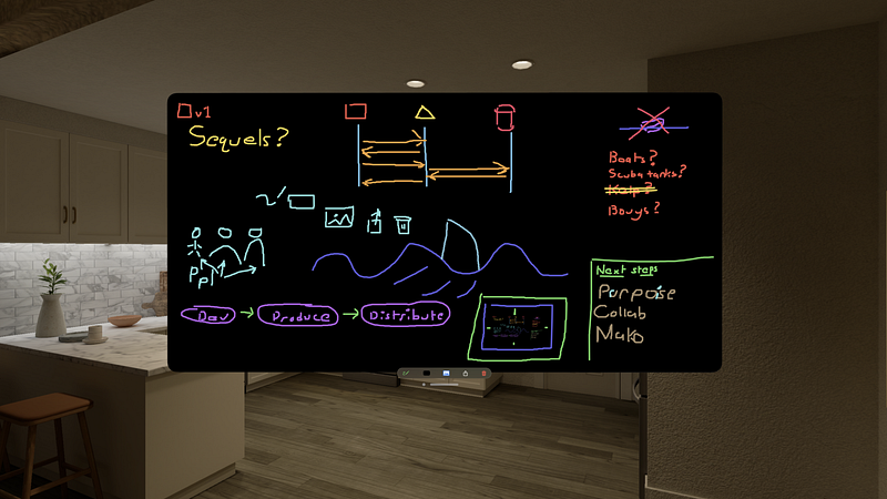 1.1.1Great White(board) is the simple whiteboard you need in your office. Great White(board) is a simple, uncomplicated working tool. Take a note, sketch an idea, diagram a process, or think through the details of a complex idea. With Great White(board, you always have the same whiteboard nearby, easy to reach, reference, and add to. And you can take it with you in your Apple Vision Pro! It's purpose is to help you get your work done, not to be the work. You can share a screenshot like you do from in-office brainstorming sessions, then erase it and start your next project. If you're looking for nicely formatted documentation that will live on, Great White(board) is not the tool you want. It’s for figuring stuff out, not documenting for posterity. Draw on it or stick pictures to it, Great White(board) is as easy to use as a real whiteboard and doesn't come with a bunch of extra features to make it more complicated. When you want to make a quick note or diagram for some work in progress, grab Great White(board), make your notes, and then get back to the job at hand. The board will hang out in space wherever you put it so you can glance at your notes whenever you need to, just like a real whiteboard.