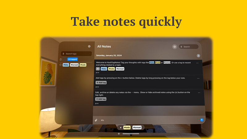 1.6HashTagNotes functions as a personal, customizable workspace for recording thoughts, consolidating useful information, and storing files and images like how you may want to message these to yourself. A unique aspect of HashTagNotes is its intuitive tagging system, which simplifies the way you manage and access your notes. Designed with a focus on speed and efficiency, it will make it much easier to take notes quickly!