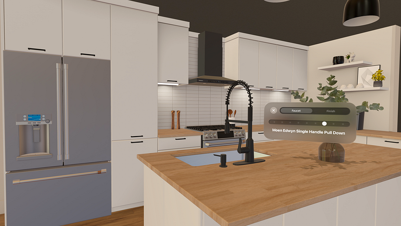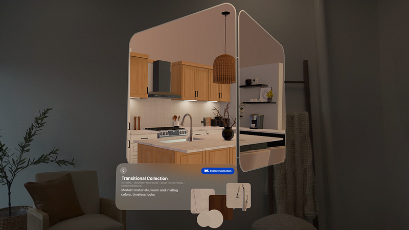 Dive into a series of awe-inspiring 3D kitchen spaces where you take the reins as designer. Start with a curated style from one of our collections and modify it to your heart’s delight, using intuitive gaze-and-tap gestures. The possibilities are limitless, and the creative power is in your hands.