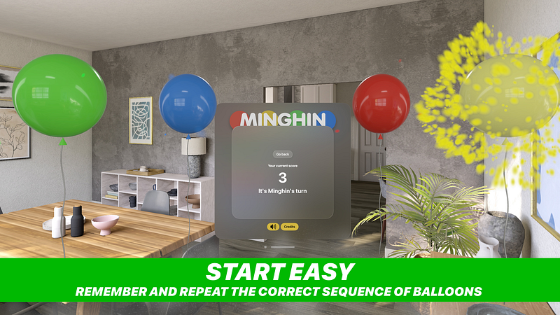 With Minghin, you can enjoy a new and exciting way to play in the infinite canvas of Apple Vision Pro. Download Minghin today and put your memory skills to the test. How many balloons can you remember? Minghin is brought to you by letvar, a team of creatives focused on crafting apps for any kind of device.