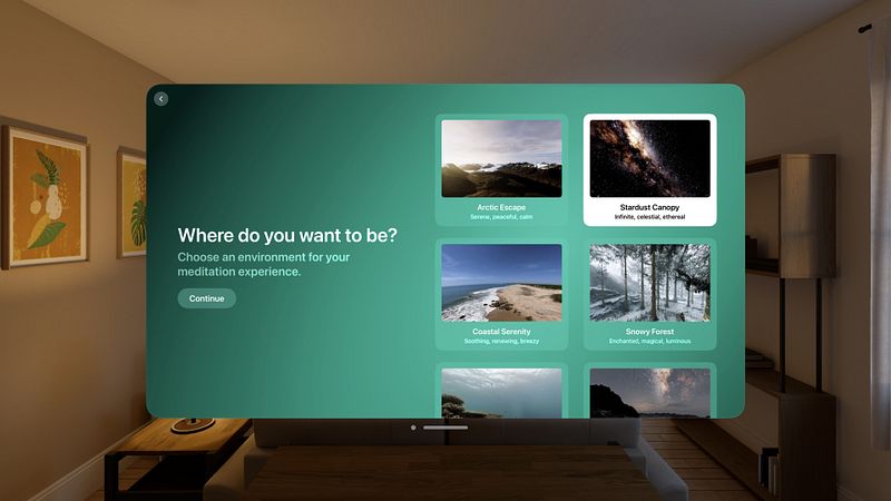 Orbit Meditation leverages AI to offer guided sessions based on your mood, preferences, and past choices, integrating seamlessly with the personalized user experience of Apple Vision Pro. Launch the app and be greeted with a meditation session curated for your current state, ready to start. Privacy and Mindfulness Together