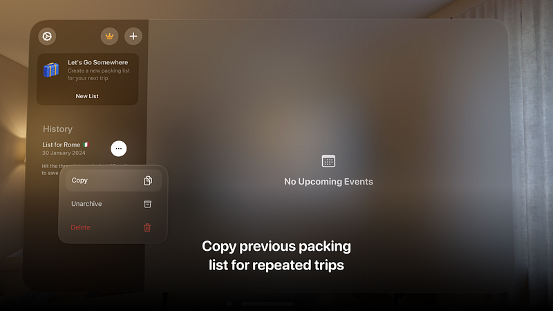 Choose from our pre-made categories to effortlessly create your packing list. From 'Beach' to 'Business', we've got you covered. ⏺ Repeat Trips Made Easy
