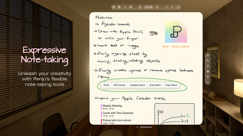 2.9.7Introducing Penjo for Apple Vision Pro: A New Dimension in Planning and Journaling Penjo brings its well-regarded digital planning and journaling platform to Apple Vision Pro, blending organization with personal reflection. With a design that aligns with the device's native look and functionalities, Penjo offers a seamless blend of organization and personal reflection, bridging your real-world and digital experiences effortlessly. Penjo's smooth integration across the Apple ecosystem, including iCloud Sync and Apple Calendar, ensures that your information is effortlessly synchronized across devices such as iPad, iPhone, and now, Apple Vision Pro. This connectivity allows you to navigate your day with ease, aligning your agenda and creative expressions beautifully. Designed for everyone from professionals to students, and journal enthusiasts, Penjo taps into the full potential of the Apple ecosystem. It provides a unique, agenda-centric platform that integrates flawlessly with your daily life. The integration of Pencil Kit for Vision Pro allows for unique expression through drawings and handwritten notes, making each entry distinctively yours. Engage with Penjo in mixed reality on Apple Vision Pro, placing your planner on your desk or as a virtual board on your wall. This immersive feature brings a new level of interaction to your planning and journaling. Key Features Across All Platforms: * Flexible Input Methods: Supports text, images, shapes, and Pencil Kit.