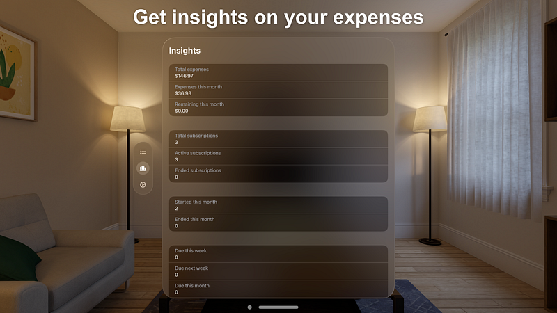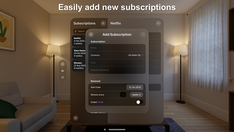 1.2.4Track your subscriptions in one place with SubManager and get notified in advance of a subscription renewal. The app is available for Apple Vision Pro, iPhone, iPad, Mac and Apple Watch and your subscriptions are synced across all your devices via iCloud.